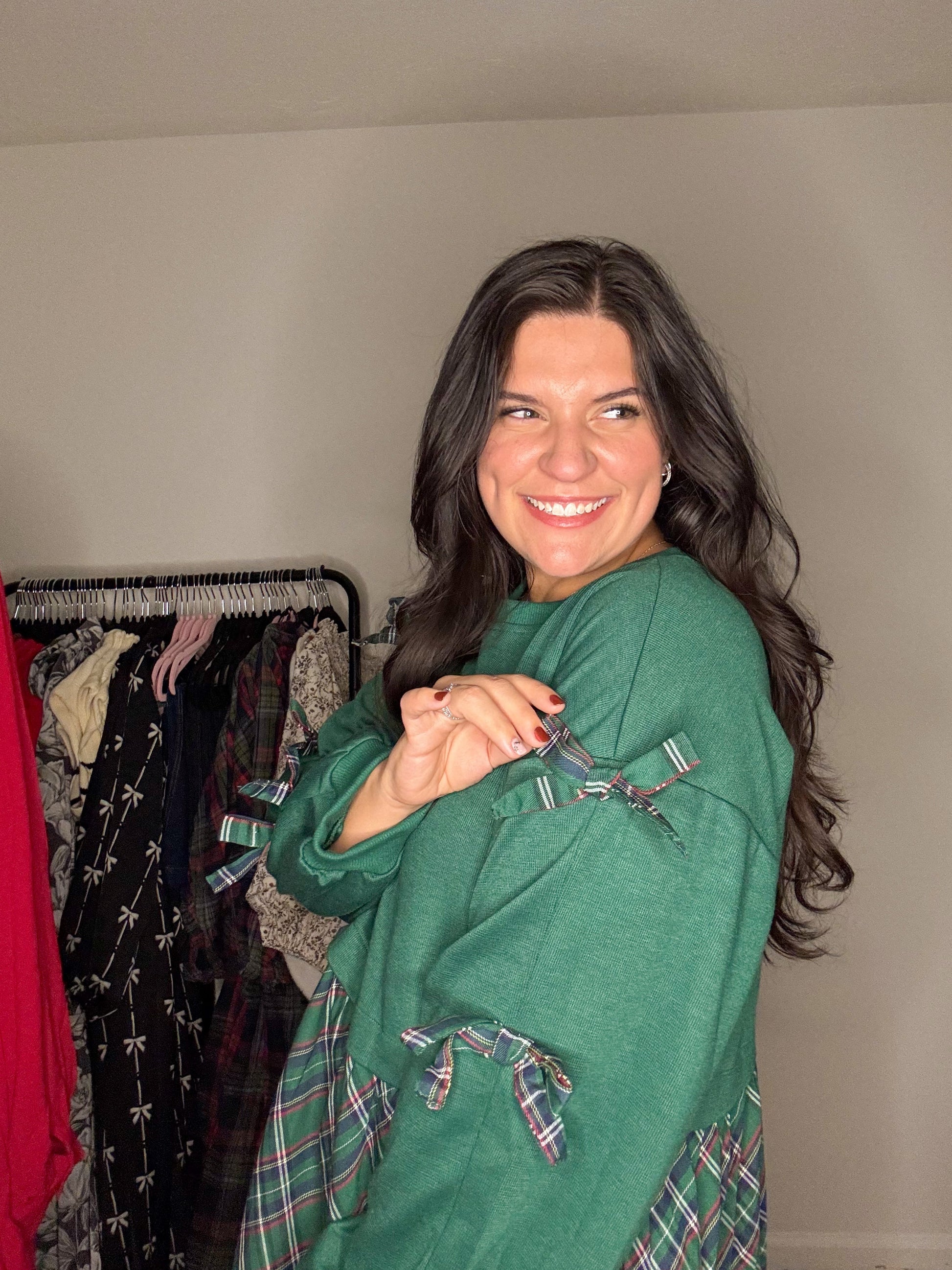 Cozy meets classic in this festive favorite. Featuring a soft sweatshirt-style bodice, a flowy green plaid skirt, and charming bow-tie sleeve details, this dress is perfect for holiday gatherings and everyday wear alike.
