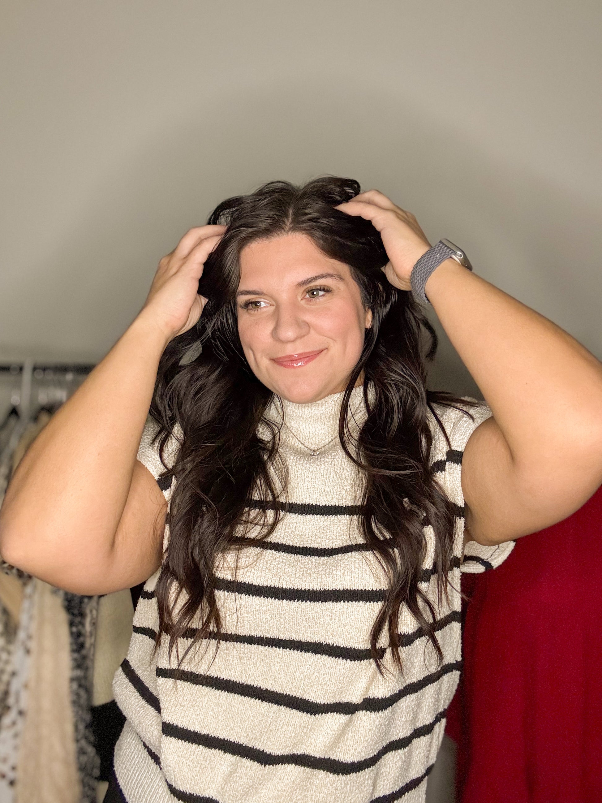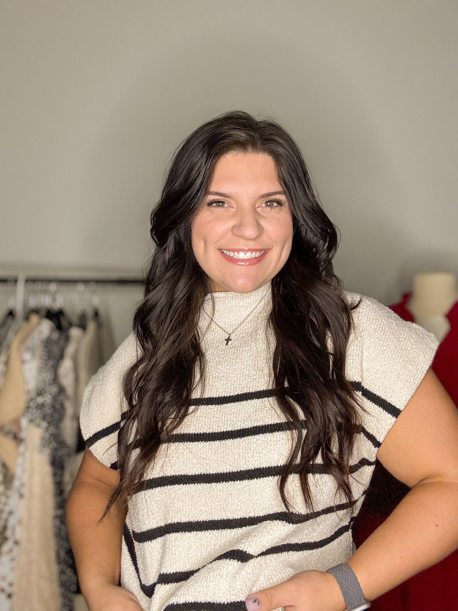Meet the Harbor Stripe Knit — the effortless, elevated top your wardrobe has been waiting for. With a soft mock neck, relaxed sleeves, and timeless black-and-cream striping, this piece gives that chic “quiet luxury” vibe with zero effort.