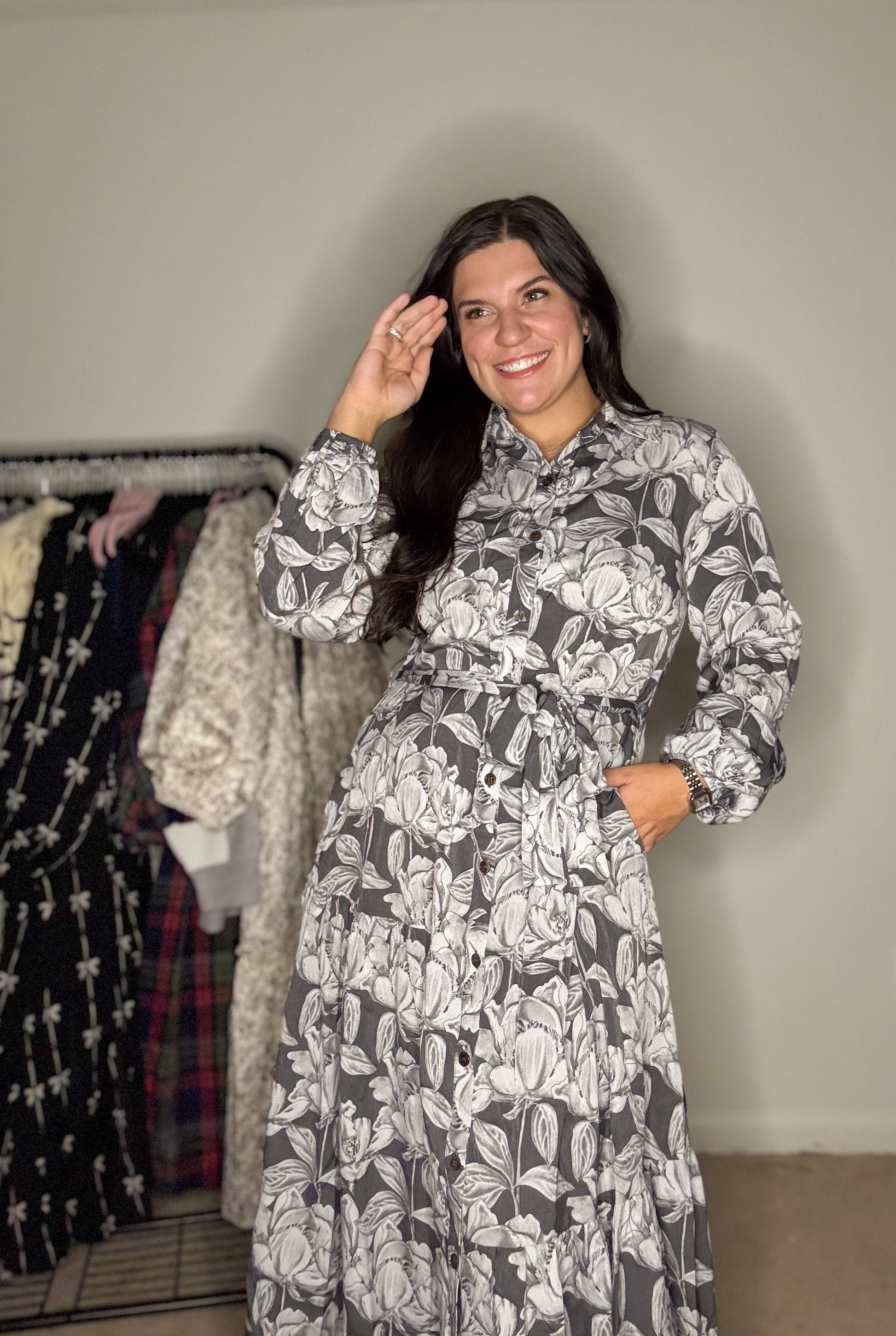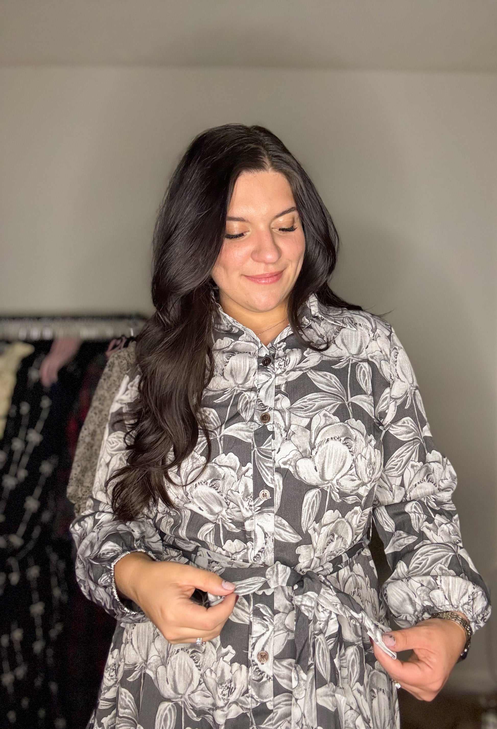 Elegant and effortless, this floral maxi is a closet staple. Designed with a button-down front and adjustable waist tie, it offers a flattering silhouette that works for every season.